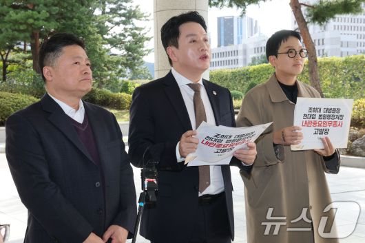 (서울=뉴스1) 이광호 기자 = 임태훈 군인권센터 소장(가운데)이 23일 오후 서울 서초구 서울고등검찰청 앞에서 내란 특검 고발인 조사 출석 및 조희대 대법원장과 천대엽 법원행정처장 고발 기자회견을 하고 있다. 2025.10.23/뉴스1
