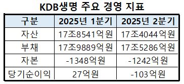 KDB생명은 2분기 연속 자본잠식 상태에 빠져 있는 상태였다. 올해 6월 말 기준 부채는 17조5286억원으로, 자산 17조4045억원을 초과한 수준이다. 자본 총계는 –1241억원이다. 올해 1분기에도 자산이 17조8541억원, 부채가 17조9889억원으로 자산 규모를 넘었고, 자본 역시 –1348억원으로 집계됐다.