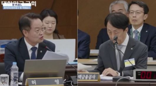 23일 오후 부산 BIFC에서 열린 국회 정무위 국정감사에서 허영 민주당 의원(왼쪽)이 김경환 주택금융공사 사장(오른쪽)에게 질의를 진행하고 있다. / 사진=국회 의사중계시스템 갈무리 |