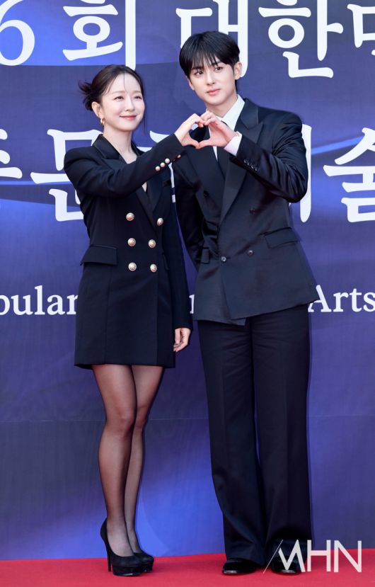 (MHN 이지숙 기자) 박선영 아나운서, 배우 김민규가 23일 오후 서울 중구 국립극장 해오름극장에서 '2025 대한민국 대중문화예술상' 시상식 레드카펫에 참석해 포즈를 취하고 있다.