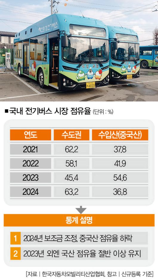 한국자동차모빌리티산업협회에 따르면 중국산 전기버스 점유율(신규 등록 기준)은 2021년 37.8%, 2022년 41.9%, 2023년 54.6%로 상승했다. 하지만 이 통계는 왜곡된 측면이 있다. 당시 전기버스 시설 확충 기간에 일선 버스 운영업체들이 전기버스를 구하는 과정에서 일시적으로 중국산 전기버스가 증가한 것에 불과하다. 실제로 지난해 중국산 전기버스 점유율은 36.8%로 크게 줄었다.