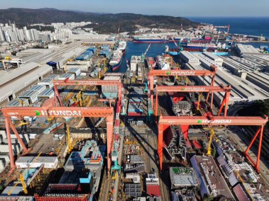 글로벌 해운 탄소세 도입이 1년 연장되면서 국내 조선업계에도 영향을 줄 것이라는 전망이 나온다. HD현대중공업 울산 야드 전경. /HD현대 |