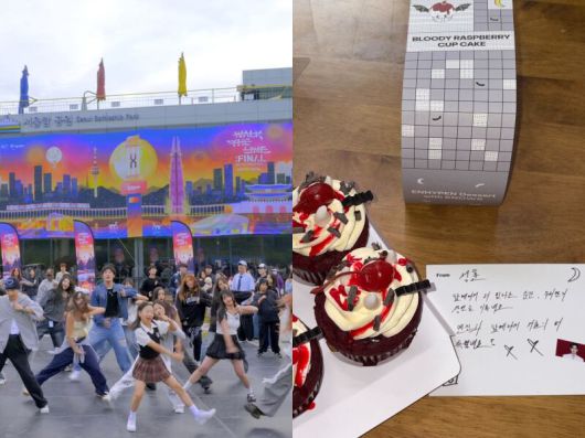 '엔하이픈 더 시티 서울'의 랜덤플래이 댄스에 참여한 팬들(왼쪽), 카페 노우즈의 엔하이픈 특별 메뉴인 라즈베리 컵케이크. /딩가딩가스튜디오, 빌리프랩 |
