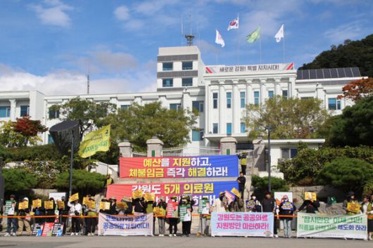 강원지역본부에 따르면 강원지역 지방의료원들은 코로나19 전담병원으로 지정·운영된 이후 진료기능 축소로 경영난을 겪은데 이어 지난해 의정갈등으로 인한 의료공백과 의사 인건비 상승 등으로 재정상태가 악화됐다. 이 때문에 지방의료원 보건의료노동자들은 임금체불로 내몰리고 있다.