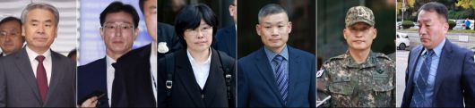 채해병 특별검사팀이 구속영장을 청구한 피의자들. 왼쪽부터 이종섭 전 국방부 장관, 임성근 전 해병대 1사단장, 유재은 전 국방부 법무관리관, 김동혁 전 국방부 검찰단장, 박진희 전 국방부 군사보좌관, 김계환 전 해병대사령관. 연합뉴스 |