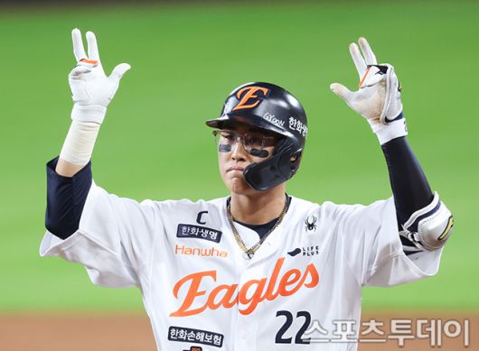 [대전=스포츠투데이 팽현준 기자] 24일 대전한화생명볼파크에서 열린 2025 KBO리그 포스트시즌 삼성 라이온즈와 한화 이글스의 플레이오프 5차전, 5회말 무사 2,3루 한화 채은성이 2타점 적시타를 때리고 있다. 2025.10.24. [스포츠투데이 팽현준 기자 sports@stoo.com]