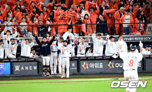 [OSEN=대전, 최규한 기자] 24일 대전 한화생명볼파크에서 ‘2025 신한 SOL Bank KBO리그’ 포스트시즌 플레이오프 5차전 삼성 라이온즈와 한화 이글스의 경기가 열렸다. 한화는 코디 폰세, 삼성은 최원태를 선발로 내세웠다. 4회말 무사 1루 상황 한화 노시환의 2루타 때 한화 더그아웃 선수들이 기뻐하고 있다. 2025.10.24 / dreamer@osen.co.kr