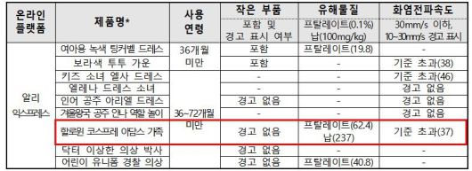 24일 한국소비자원은 중국계 쇼핑 직구 플랫폼인 알리익스프레스·테무에서 판매 중인 어린이 드레스·코스튬 17종(알리 10·테무 7)을 시험한 결과 52.9%인 9종이 국내 안전기준에 부적합했다고 밝혔다. 부적합 판정 9종은 모두 알리익스프레스 판매 제품이었다.
