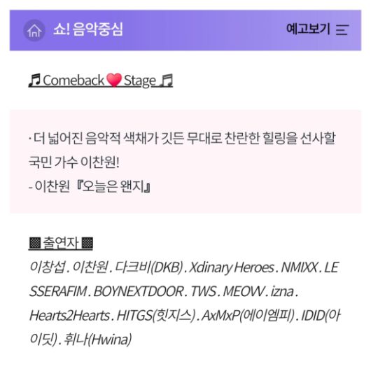 '쇼! 음악중심'은 이찬원을 ""더 넓어진 음악적 색채가 깃은 무대로 찬란한 힐링을 선사할 국민 가수"라고 소개했다.