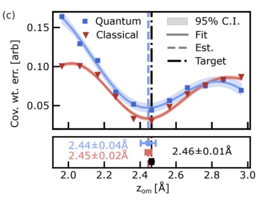 논문에 따르면 양자칩은 이 거리가 2.44±0.04A(옹스트롬)이라고 계산했습니다. A은 원자 지름을 재기 위한 길이 단위로 1A은 0.1㎚(나노미터), 즉 100억 분의 1m에 해당합니다. 고전적 시뮬레이션, 즉 슈퍼컴퓨터 계산으로 Zom는 2.45±0.02A이고요. 기보고된 수치는 2.46±0.01A입니다. 기보고된 수치와 얼마나 일치하는지를 보면 양자 계산이 고전적 계산보다는 조금 덜 정확하지만 실용적 문제 계산에서 이 정도 정확도면 양자컴퓨터로서는 상당한 진전이라는 게 논문의 취지입니다.