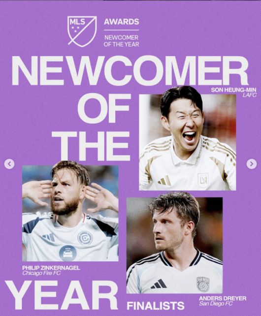 MLS 컵 플레이오프를 준비하는 손흥민에 축하할 소식이 전해졌다. MLS 2025 시즌 신인왕 후보로 선정된 것. MLS는 24일(한국시간) 공식 SNS를 통해 "이번 시즌 신인왕 후보는 손흥민, 필립 진커나겔, 앤더스 드라이어"라고 발표했다.