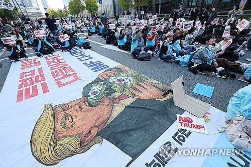(서울=연합뉴스) 신현우 기자 = 2025 아시아태평양경제협력체(APEC) 정상회의 개막을 엿새 앞둔 25일 서울 숭례문 인근 세종대로에서 '트럼프저지공동행동'이 연 도널드 트럼프 미국 대통령 규탄 집회가 열리고 있다. 2025.10.25