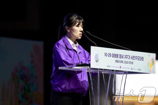 (서울=뉴스1) 이호윤 기자 = 송해진 10·29이태원참사 희생자 유가족협의회 운영위원장이 25일 서울 중구 서울광장에서 열린 10.29 이태원참사 3주기 시민추모대회에서 인사말을 하고 있다. (공동취재) 2025.10.25/뉴스1256@news1.krCopyright ⓒ 뉴스1. All rights reserved. 무단 전재 및 재배포, AI학습 이용 금지.