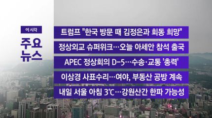 ■ 트럼프 "한국 방문 때 김정은과 회동 희망" ■ 정상외교 슈퍼위크…오늘 아세안 참석 출국 ■ APEC 정상회의 D-5…수송·교통 '총력' ■ 이상경 사표수리…여야, 부동산 공방 계속 ■ 내일 서울 아침 3℃…강원산간 한파 가능성 [저작권자(c) YTN 무단전재, 재배포 및 AI 데이터 활용 금지] 대한민국 24시간 뉴스채널 [YTN LIVE] 보기 〉 [YTN 단독보도] 모아보기 〉