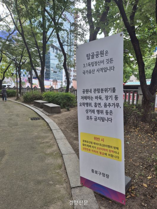 지난 10월 21일 서울 종로구 탑골공원 안에 바둑 등 오락행위를 금지하는 안내판이 세워져 있다. 김향미 기자 |