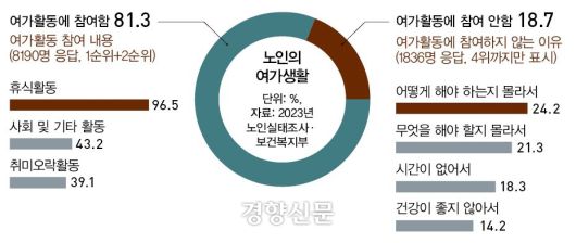 2023년 노인실태조사에 따르면 노인들의 여가활동으로 ‘휴식활동’(96.5%·1순위+2순위)이 가장 많은 비중을 차지했다. 산책, 음악 감상, 가족·친지 방문, 목욕·사우나·낮잠 등이다. 노인의 26.5%가 경로당, 9.6%가 노인복지관, 3.5%가 사회복지관·장애인복지관·여성회관 등을 이용했다. 탑골공원은 이들 기관에 등록되는 걸 꺼리거나, 기관 활동에 흥미가 없거나, 기관에 다니면서도 추가로 시간을 보낼 공간이 필요한 이들이 찾는 것으로 보인다. 영등포구에서 지하철 1호선을 타고 일주일에 한 번씩 탑골공원에 온다는 E씨(87)는 “답답하니까 바람 쐬러” 탑골공원에 온다고 했다. 한 번 오면 2시간씩 쉬면서 사람 보고 경치 보며 쉬어간다고 했다. 부인과 자녀 가족과 함께 사는 그는 집 근처에는 공원은 없어서 탑골공원에 안 나오는 날에는 주로 집에서 TV를 보거나 실내자전거를 타면서 시간을 보낸다고 했다.