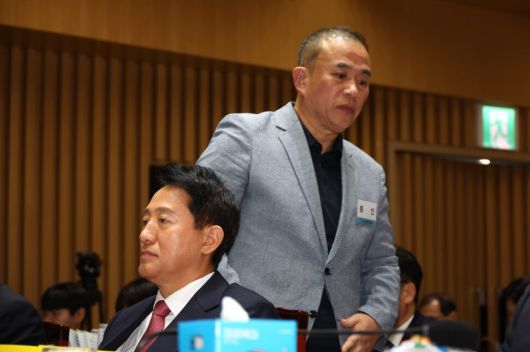 23일 서울시청에서 열린 국회 행정안전위원회 국정감사에서 증인으로 출석한 명태균씨가 발언대로 가기 위해 오세훈 서울시장 곁을 지나가고 있다. 류우종 선임기자 wjryu@hani.co.kr |