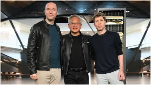왼쪽부터 그레그 브로크먼 오픈에이아이(AI) 사장, 젠슨 황 엔비디아 최고경영자(CEO), 샘 올트먼 오픈에이아이 최고경영자. 엔비디아 제공 |