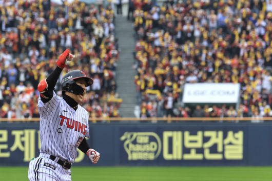 26일 서울 잠실구장에서 열린 2025 신한 SOL 뱅크 KBO 한국시리즈 한화 이글스-LG 트윈스 1차전 경기. 5회말 LG 선두타자 박해민이 솔로홈런을 날리고 그라운드를 돌고 있다. [연합] |