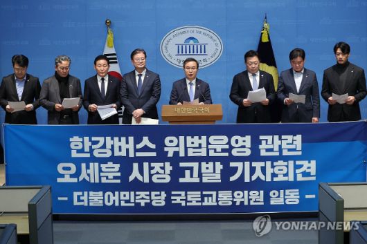 국토위 소속 민주당 의원들은 26일 오후 국회 소통관에서 기자회견을 열고 "오 시장이 정치적 치적을 쌓기 위한 목적으로 한강 버스 사업을 무리하게 추진하고 있다"며 이같이 밝혔다. 이건태 의원은 회견문 낭독을 통해 "SH공사가 민간 회사에 담보도 확보하지 않은 채 876억원을 대여해 준 것은 명백한 배임 행위"라며 "정부나 지방자치단체가 876억원이라는 엄청난 자금을 대여하면서 담보를 단 1원도 확보하지 않은 것은 그 유례를 찾을 수 없다"고 지적했다.