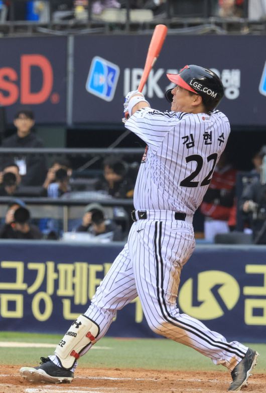 26일 잠실야구장에서 열린 2025 프로야구 한국시리즈 한화이글스 대 LG 트윈스 1차전 경기. 6회말 LG 김현수가 1타점 적시타를 날리고 있다. 사진=연합뉴스 |
