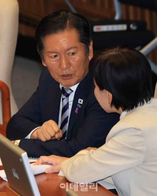 [이데일리 노진환 기자] 정청래 더불어민주당 대표와 전현희 의원이 26일 서울 여의도 국회에서 열린 제429회국회(정기회) 제10차 본회의에서 대화하고 있다. |
