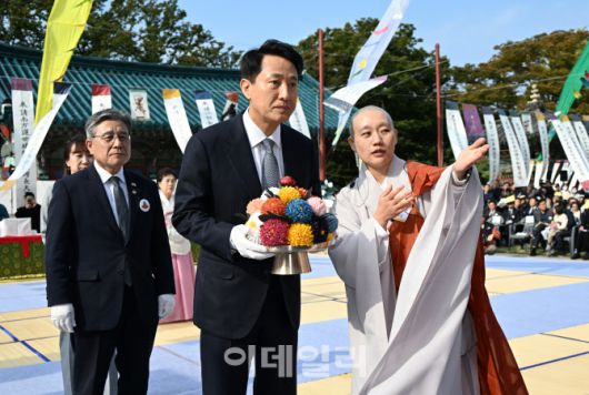 [이데일리 김태형 기자] 오세훈 서울시장이 25일 서울 은평구 진관사에서 열린 ‘진관사 국행수륙재’에 참석해 헌화하고 있다.