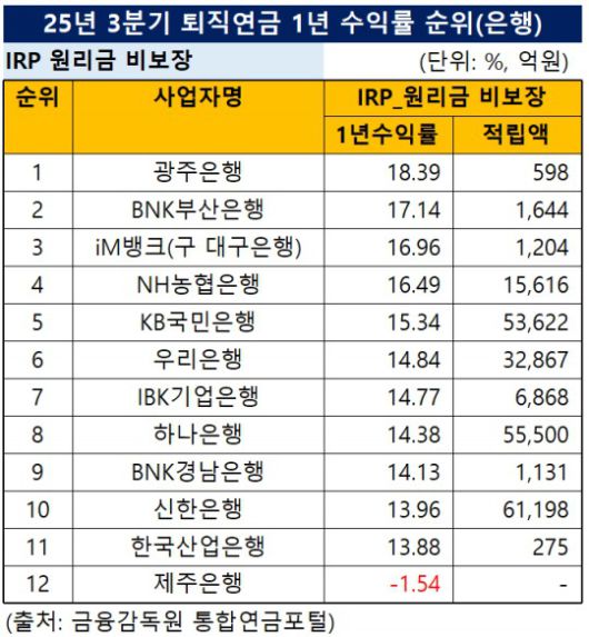 한국금융신문 KFT금융연구소가 금융감독원 통합연금포털 자료를 분석한 결과에 따르면 광주은행의 원리금 비보장 IRP형 1년 수익률은 18.39%로 시중은행을 포함한 전 은행 가운데 가장 높았다. 부산은행(17.14%)과 iM뱅크(16.96%)가 뒤를 이었으며 경남은행은 14.13%로 나타났다.