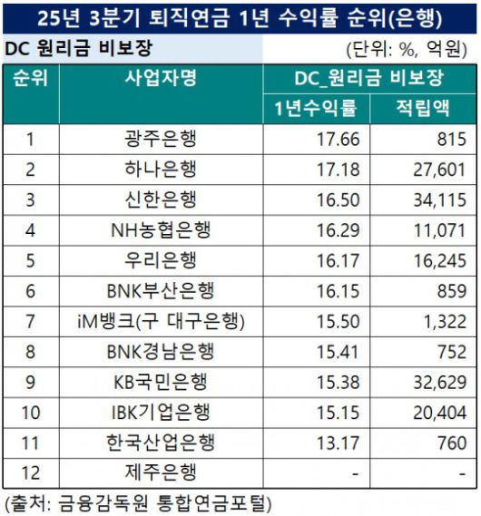 반면 같은 기간 광주은행은 IRP와 DC형 모두 전체 은행 중 1위를 차지하며 퇴직연금 시장 내 존재감을 한층 강화했다.