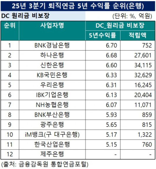 장기 성과에서는 구도가 달랐다. 5년 기준 DC형 수익률은 경남은행이 6.70%의 수익률을 내며 전체 은행 중 1위를 달성했고, 이어 부산은행 5.93%, 광주은행 5.65%, iM뱅크 5.17% 순이었다.