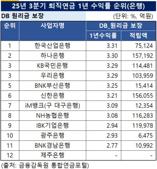 원리금 보장 확정급여형(DB) 부문에서는 부산은행이 1년 수익률 3.25%로 지방은행 중 가장 높았고, 적립액도 1조5414억원 규모로 가장 많았다. iM뱅크는 3.09%의 수익률을 냈으며 적립액은 1조2354억원이다. 이어 광주은행은 2.93%(6475억원), 경남은행은 2.77%(1조992억원)를 기록했다.