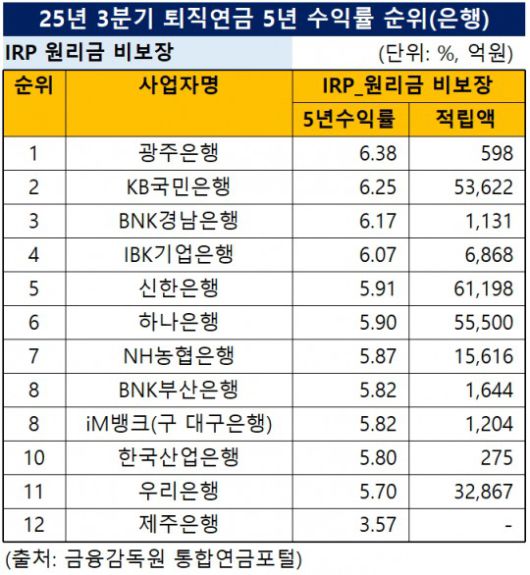 5년 기준 IRP형 수익률에서도 광주은행이 6.38%로 전체 은행 1위였으며 이어 경남은행(6.17%), 부산은행(5.82%), iM뱅크(5.82%), 제주은행(3.57%) 순으로 나타났다.