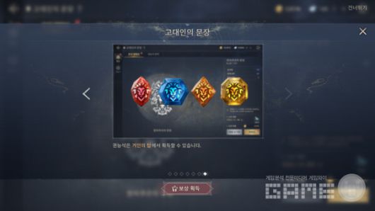 '고대인의 문장'은 거인의 탑에서 얻을 수 있는 '권능석'을 통해 강화된다. 권능석은 '감정'을 통해 잠재 능력을 확인하고, '세공'을 통해 레벨을 높일 수 있다. 장착한 권능석의 옵션에 따라 캐릭터 성능이 크게 달라지므로, 플레이 스타일에 맞는 세공 방향을 잡는 것이 중요하다. 이 시스템은 장비 강화 이상의 깊이를 제공하며, 무과금 유저에게도 꾸준한 스펙 상승 루트로 작용한다.