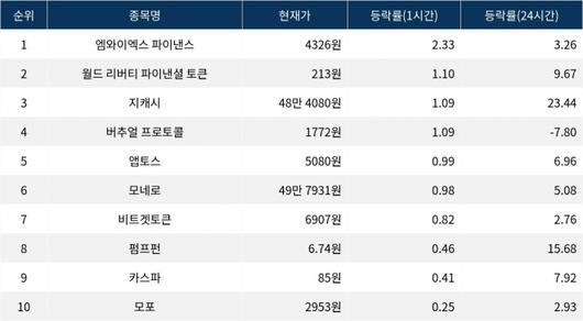 한편, 모네로는 1시간 동안 0.98% 상승하며 현재가 49만 7931원을 기록했다. 비트겟토큰은 0.82% 상승했으며 현재가는 6907원이다. 펌프펀은 0.46% 상승하며 현재가 6.74원을 기록했다. 카스파는 0.41% 상승하며 현재가 85원을 기록했다. 같은 시각, 모포는 0.25% 상승하며 현재가 2953원을 기록했다.