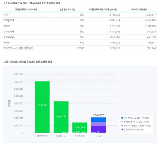 이외에도 △네이버 메일 139만원 △네이버 쇼핑 97만원 △소셜미디어 45만원 △동영상 7만원 △기타(번역·뉴스·웹툰·간편결제) 56만원 등의 가치를 누리는 것으로 추산됐다.