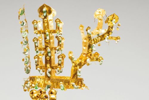 구부러진 옥 장식과 달개(금관 등에 매달아 반짝거리도록 한 얇은 쇠붙이 장식)는 생명력과 재생, 황금빛은 절대 권력과 부를 상징한다고 박물관 측은 전했다.
