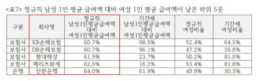 정규직의 경우, 44개사 중 전북은행과 메리츠증권을 제외한 42개사에서 여성의 임금이 남성보다 낮았다. 가장 격차가 큰 곳은 KB손해보험으로 60.7%였고 하위권 4개사 모두 보험사였다.