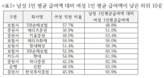 그 뒤를 이어 메리츠증권(51.0%), 키움증권(53.4%), 메리츠화재(56.0%), 현대해상(58.3%) 순으로 격차가 컸으며, 하위 5개사 모두 보험사와 증권사였다. 격차가 가장 적은 곳은 수협은행(83.8%)으로 나타났지만 이 역시 성별임금격차가 완전히 해소된 것은 아니라는 분석이다.