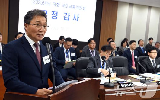27일 오전 인천 중구 운서동 인천국제공항공사 대회의실에서 열린 국회 국토교통위원회의 인천국제공항공사 등에 대한 국정감사에서 이학재(왼쪽)인천국제공항공사 사장이 업무보고를 하고 있다. 2025.10.27/뉴스1 ⓒ News1 공항사진기자단 |