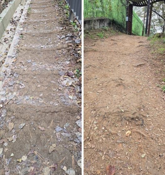 국립현충원 둘레길의 야자매트의 미세플라스틱이 노출돼 있다.(사진=SDG뉴스) |