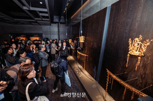 국립경주박물관에서 27일 열린 특별전 ‘신라 금관, 권력과 위신’ 언론 공개회 참석자들이 황남대총 북분 금관을 관람하고 있다. 경주 | 이준헌 기자 |