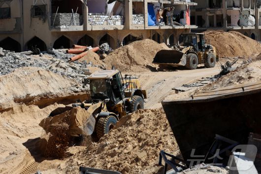 (칸유니스 로이터=뉴스1) 강민경 기자 = 팔레스타인 가자지구 칸유니스에서 18일 중장비들이 시신 수색 작업에 투입되고 있다. 2025.10.18 ⓒ 로이터=뉴스1 Copyright ⓒ 뉴스1. All rights reserved. 무단 전재 및 재배포, AI학습 이용 금지.