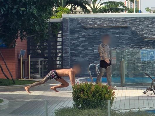 26일 오후(현지시간) 한국 청년들이 갇혀있는 것으로 추정되는 캄보디아 프놈펜의 한 고급 아파트 단지에서 문신이 가득한 남성들이 체력 단련을 하고 있다 (사진=연합뉴스) |