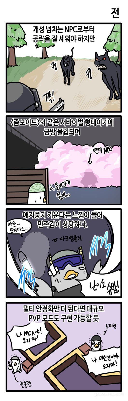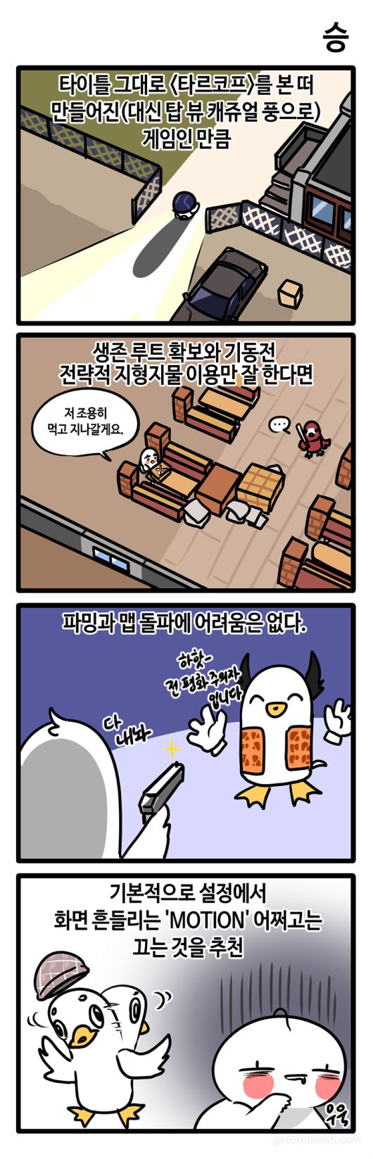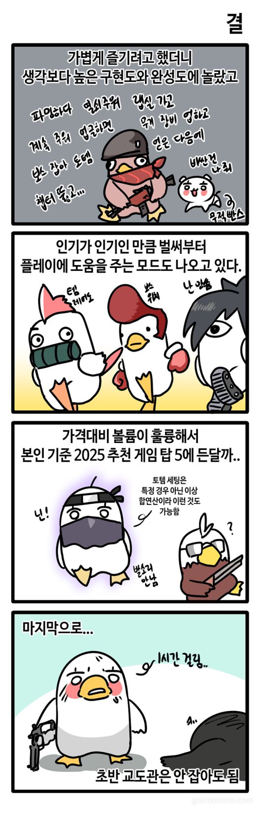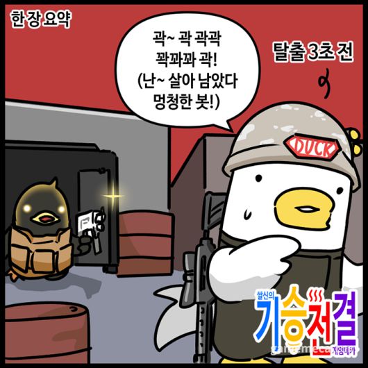 [게임찍먹], [징징징], [이웃집 D바] 등을 그린 웹툰작가 쌀신이 게임메카 리뷰툰 [기승전결]로 돌아왔습니다. 바쁜 현대인들을 대신해 최신 게임들을 플레이해보고, 최대한 간결한 정보와 함께 장점, 단점, 매력 등을 소개합니다. 이번에 알아볼 게임은 흥행 돌풍을 일으킨 오리게임 '이스케이프 프롬 덕코프(Excape from Duckov)'입니다. 타이틀명부터 '이스케이프 프롬 타르코프'의 패러디인데, 탁월한 완성도와 몰입감으로 손을 뗄 수 없게 만듭니다.