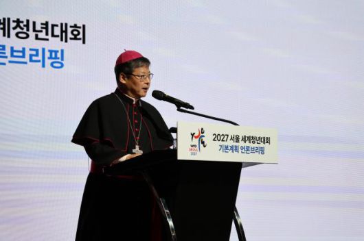 정순택 천주교 서울대교구장 대주교가 27일 서울 서초구 가톨릭대 옴니버스파크에서 열린 '2027 서울 세계청년대회 기본계획 언론브리핑'에서 인사말을 하고 있다. |