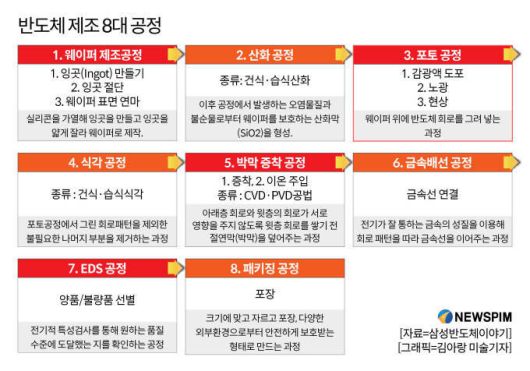 포토공정은 웨이퍼 위에 회로(전자가 이동할 통로)를 만드는 과정이다. 크게 ①노광 : 웨이퍼 위에 포토레지스트를 얇고 균일하게 도포한 후 그 위에 반도체 회로 패턴이 그려진 마스크를 놓고 웨이퍼를 향해 빛을 쏘면 웨이퍼 위로 미세 회로 패턴이 형성됨 ②현상 : 노광 과정에서 빛이 닿은 부분과 빛이 닿지 않은 부분의 화학적 성질이 달라지는데, 현상액(디벨로퍼)을 통해 빛에 노출된 포토레지스트 부분을 제거하면, 웨이퍼 표면에 원하는 패턴이 형성되는 과정으로 이뤄진다.