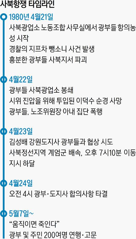 박정희 사망 이후 정국 수습을 앞세워 전두환이 계엄령을 발동했던 1980년 4월21일. 강원도 정선군 사북읍에 위치한 (주)동원탄좌 소속 사북광업소 탄광노동자들이 저임금과 어용노조 등에 분노해 일어섰다. ‘일한 만큼 임금을 받고 인권을 존중받고 싶다’는 정당한 요구를 내세웠지만, 신군부의 보도통제를 받은 언론은 이들을 ‘빨갱이’ ‘폭도’로 낙인 찍었다. 당시 200여 명이 연행돼 고문을 당했고, 28명이 군사재판에서 유죄 판결을 받았다. 사북항쟁은 야만의 시대 국가폭력의 대표적 사례로 기록됐다.