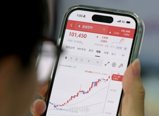 삼성전자 주가가 처음으로 10만원을 돌파한 27일 한 시민이 휴대폰으로 주식 시세와 차트를 확인하고 있다. 강윤중 기자 |
