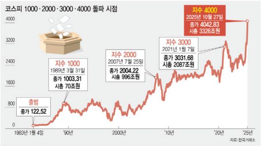 조수홍 NH투자증권 리서치센터장은 “코스피 4000포인트 달성은 이번주 아시아태평양경제협력체(APEC) 정상회의와 미국 연방공개시장위원회(FOMC) 등 굵직한 이벤트를 앞두고 기대감이 반영된 결과”라면서 “이후에도 AI 투자 확대, 통화 완화 기조 등에 힘입어 긍정적인 흐름이 이어질 것”이라고 내다봤다. 그러면서 “단기적으로는 일부 조정이나 숨고르기 장세가 연출될 수 있지만 장기적으로는 내년까지 우상향 기조가 예상된다”며 “5000피도 가시권 안에 들어왔다”고 분석했다.