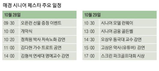 강연 외 즐길 거리도 많아 액티브 시니어의 오감을 자극할 예정이다. 시니어 모델 뮤지컬 공연과 패션쇼를 포함해 시니어 금융 골든벨, 퍼스널 컬러 찾기, 스크린 파크골프대회 등 시니어가 직접 참여할 수 있는 체험형 프로그램이 마련됐다.
